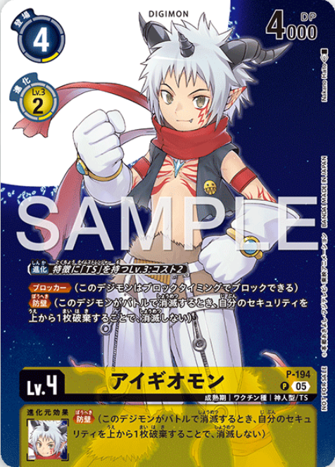 上方效果 〔進化〕擁有「TS」特徵Lv.3:消耗值2 《格擋》(此數碼寶貝在格擋時間可以進行格擋) 《壁壘》(此數碼寶貝在對戰中即將消滅時,從我方安全區最上面廢除1張卡片,即不會消滅) 下方效果 《壁壘》(此數碼寶貝在對戰中即將消滅時,從我方安全區最上面廢除1張卡片,即不會消滅)