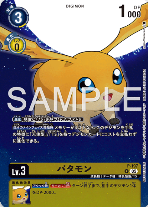 上方效果 〔進化〕擁有「TS」特徵Lv.2:消耗值0 【我方主要階段開始時】若記憶體在4以下,此數碼寶貝不需耗費消耗值即可進化成手牌中擁有「天使型」/「TS」特徵的數碼寶貝卡。 下方效果 【攻擊時】[每回合1次]在回合結束前,對方1隻數碼寶貝的DP值-2000。