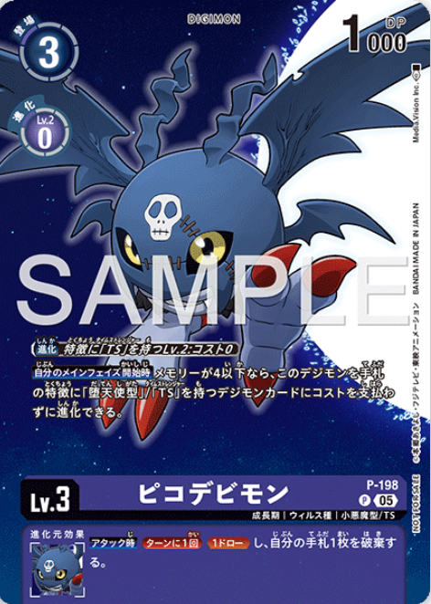 上方效果 〔進化〕擁有「TS」特徵Lv.2:消耗值0 【我方主要階段開始時】若記憶體在4以下,此數碼寶貝不需耗費消耗值即可進化成手牌中擁有「墮天使型」/「TS」特徵的數碼寶貝卡。 下方效果 【攻擊時】[每回合1次]《1抽》、廢除我方手牌1張。