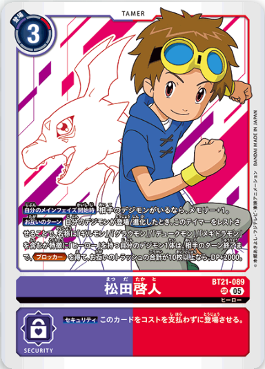 上方效果 【我方主要階段開始時】若場上存在對方數碼寶貝,記憶體+1。 【雙方回合】我方數碼寶貝登場/進化時,使此馴獸師休息,我方1隻名稱包含「基爾獸」/「古拉獸」/「紅蓮騎士獸」/「滅世魔龍獸」或擁有「英雄」特徵的數碼寶貝,在對方回合結束前,獲得《格擋》、若雙方廢卡區的卡片合計有10張以上,DP值+2000。 下方效果 【安全區】不需耗費消耗值即可登場。